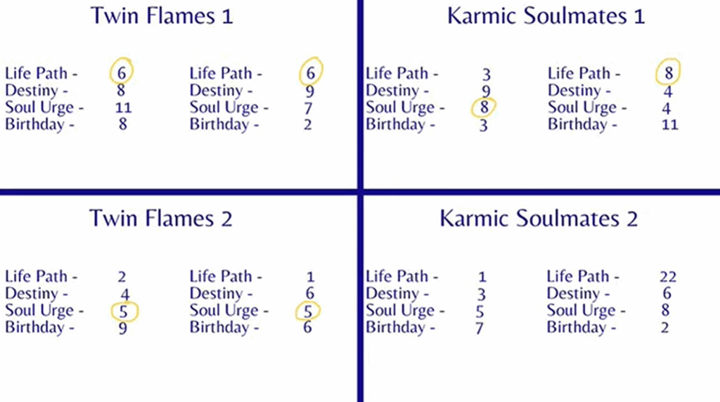 I then got to the part in the video that shows if our Life Path number or Soul Urge numbers match, then it’s an indication we are indeed twin flames and not karmic soulmates.