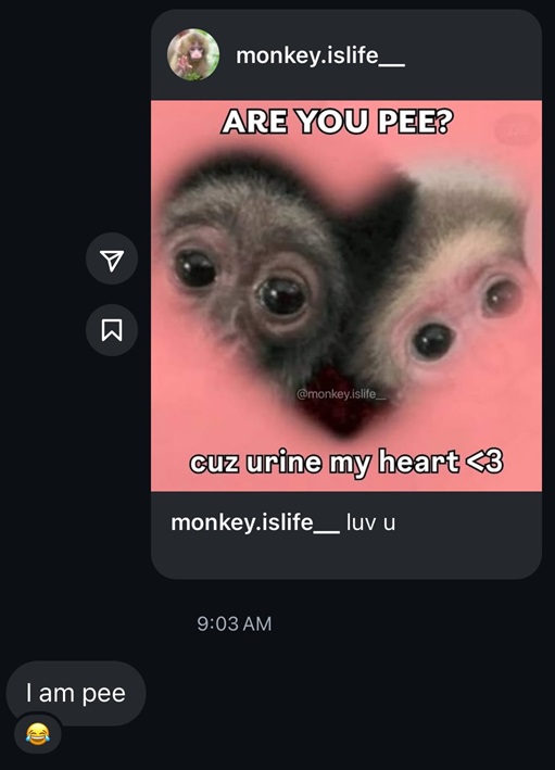 I appreciate this friend a lot. One day, I lost track of things and ended up sending her 30~ instagram reels overnight and she responded to every single one of them 😫. I felt so bad because I had no idea how many I sent in total. I was just so excited to send her all of these funny reels that I think she would enjoy. Poor lady had homework to do for breakfast! I try to be more mindful about it now though. Also, what kind of friend responds like this?! She’s da best pee I could ever ask for 🥹